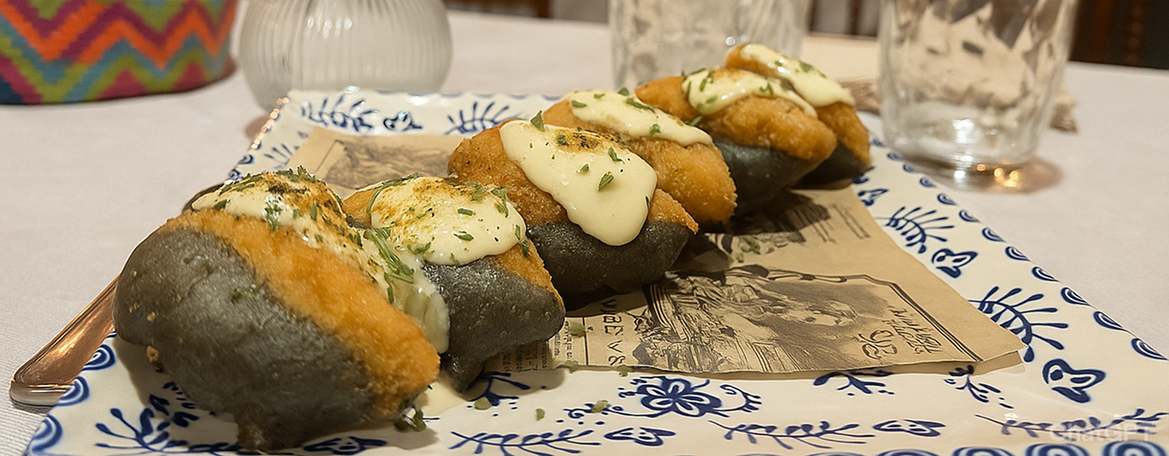 Lingote de oreja de lechón estilo Sichuan, cocinada a baja temperatura y terminada a la plancha con salsa brava de chile chipotle ahumado y mayonesa de lima